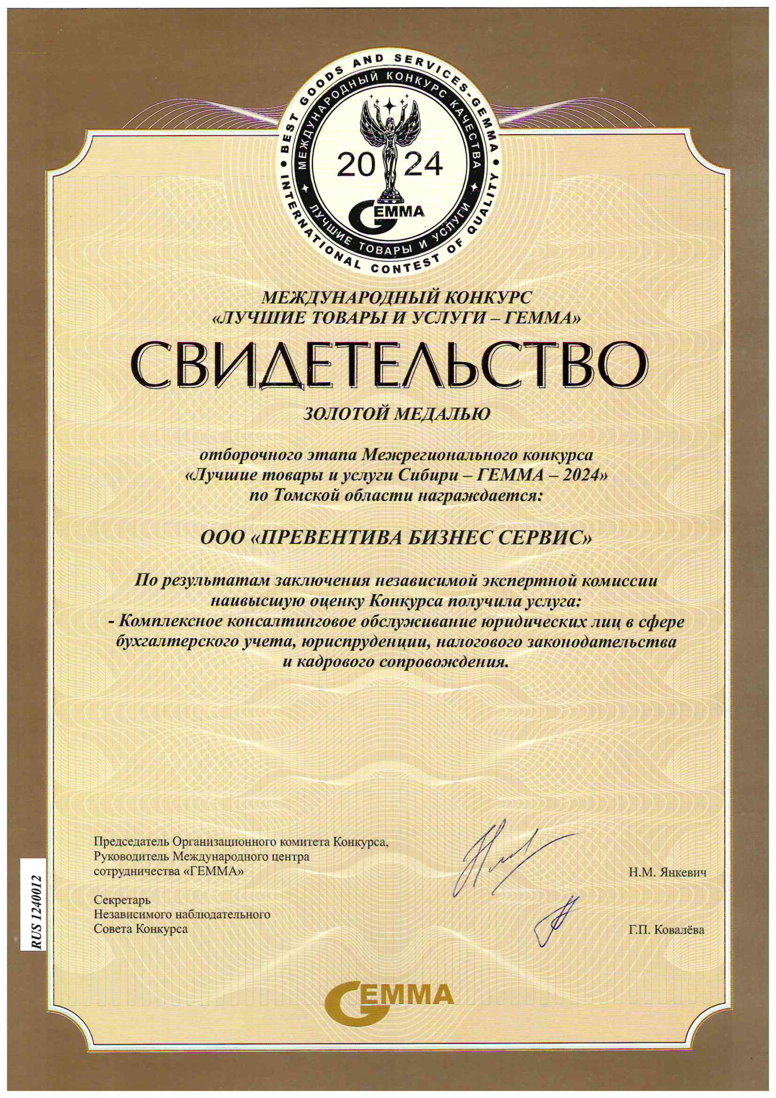 Конкурс «Лучшие товары и услуги Сибири — Гемма» — это межрегиональный проект, реализуемый под патронажем Межрегиональной ассоциации «Сибирское соглашение». Конкурс «ГЕММА» проводит работу с 2002 года на территории 60 регионов России и 64 стран мира в том числе и в Томской области. «Превентива» в 2004 году была награждена золотой медалью за лучшие товары и услуги Сибири по Томской области, получив наивысшую оценку 53,75 из 60 баллов за консультационно-юридическую помощь налогоплательщикам.