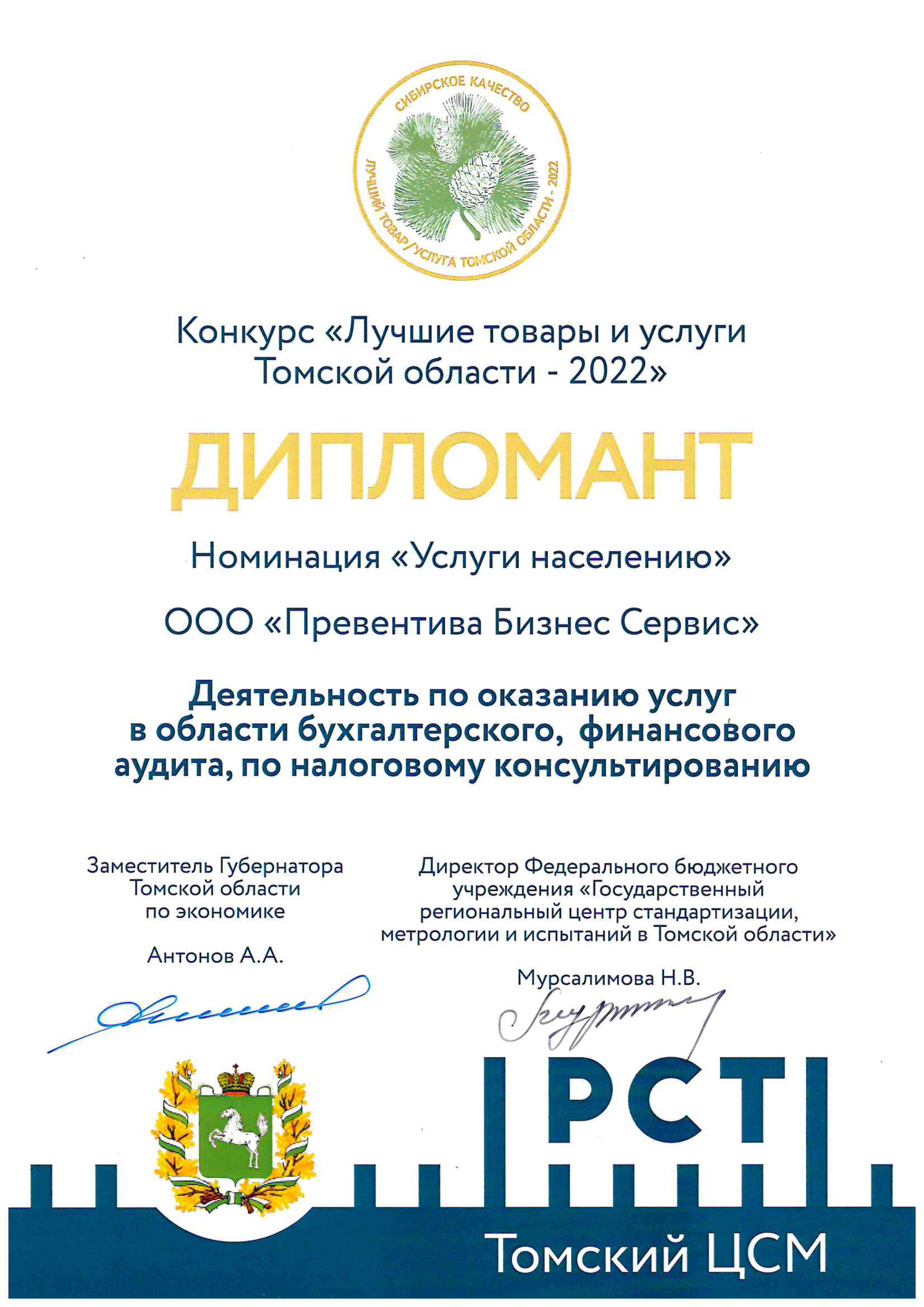 Конкурс «100 лучших товаров России» проводится с 1998 года по инициативе Государственного комитета Российской Федерации по стандартизации и метрологии (ныне – Росстандарт), общественной организации «Академия проблем качества» и информагентства «Стандарты и качество». В 2022 году Дипломом лауреата регионального этапа конкурса были отмечены услуги в области бухгалтерского учета и налогового консультирования. Этот успех стал важным этапом в истории компании, демонстрируя её вклад в развитие стандартов качества в сфере бухгалтерского и налогового консалтинга. Получение такого признания — не только почет, но и признание того, что «Превентива» соответствует самым высоким требованиям в своей нише.